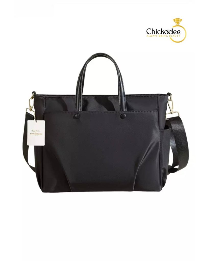 Large Capacity Nylon Oxford Patch Faux Leather Tote Bag- Elegant Black