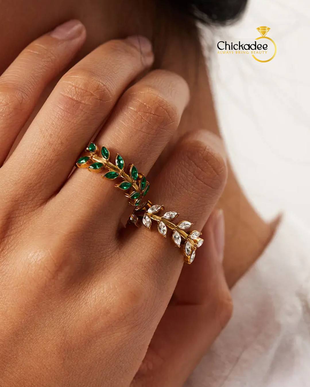 New Arrival Stainless Steel Ring 18K Gold Leaf-shaped Inlaid White and Green Zircon Rings