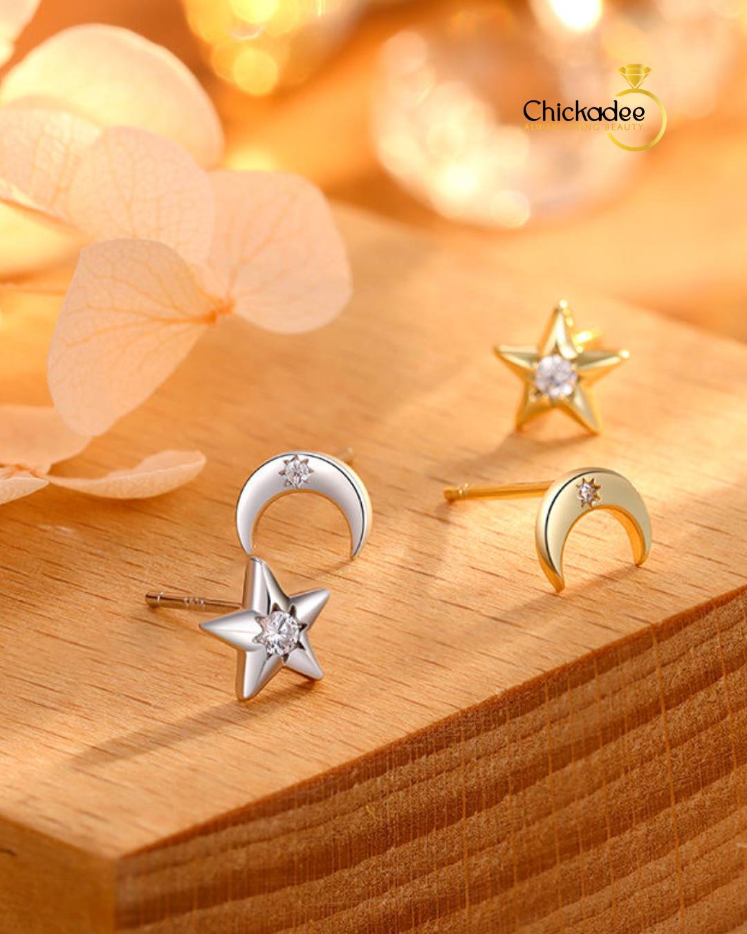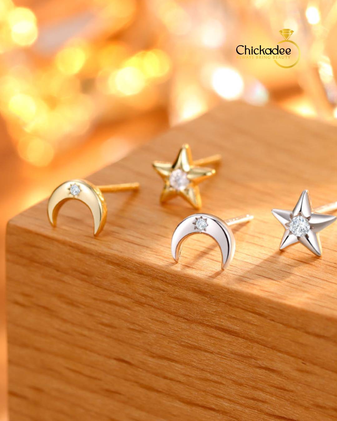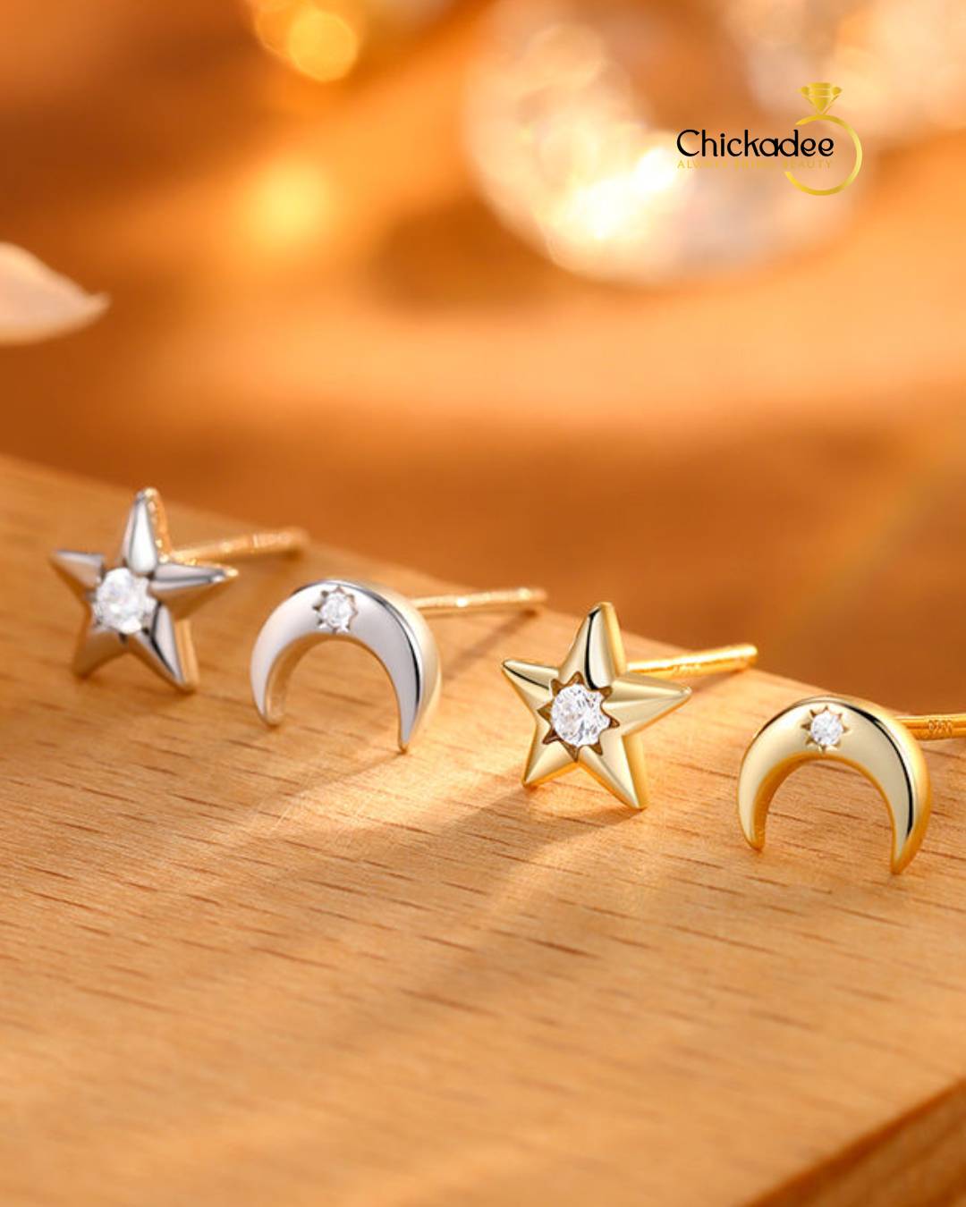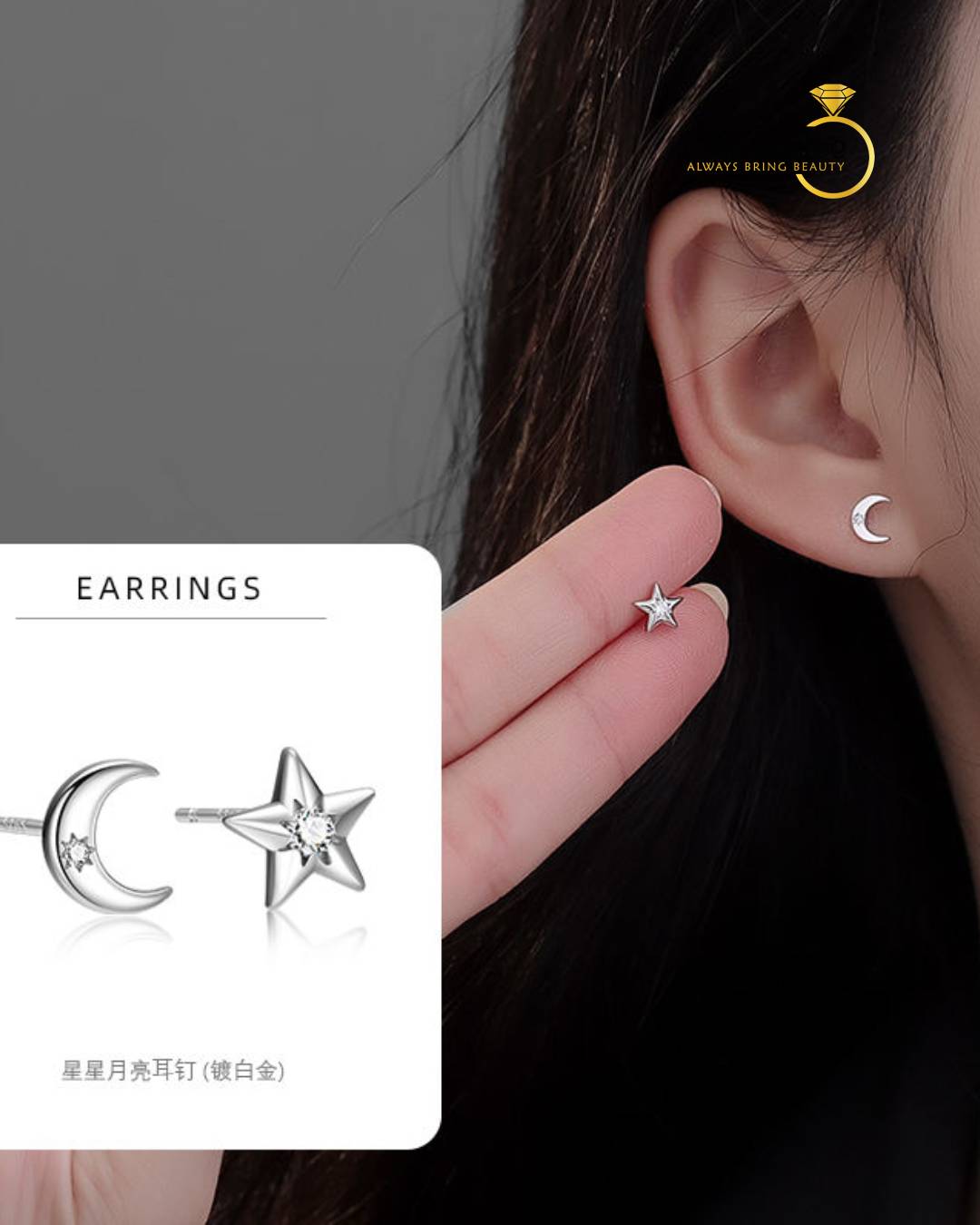925 Sterling Silver Earrings Set Small CZ Star Moon Minimalist Stud- Silver