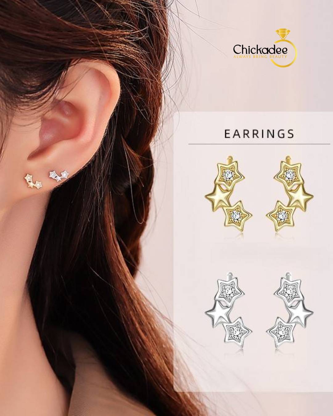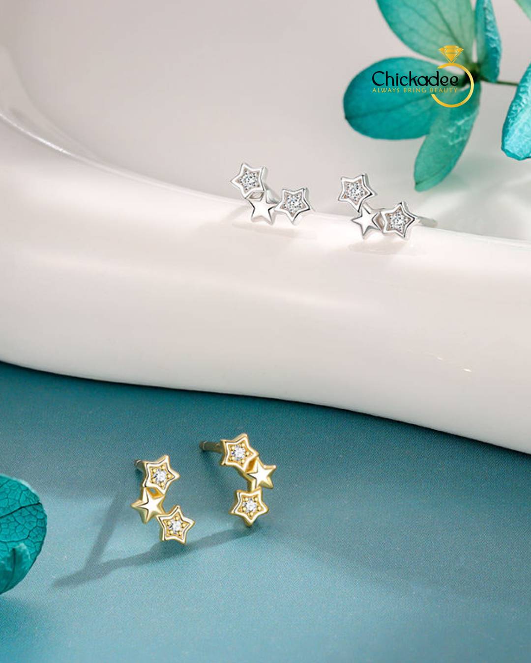 925 Sterling Silver Star Stud Bezel CZ Cute Three Stars Earrings Set
