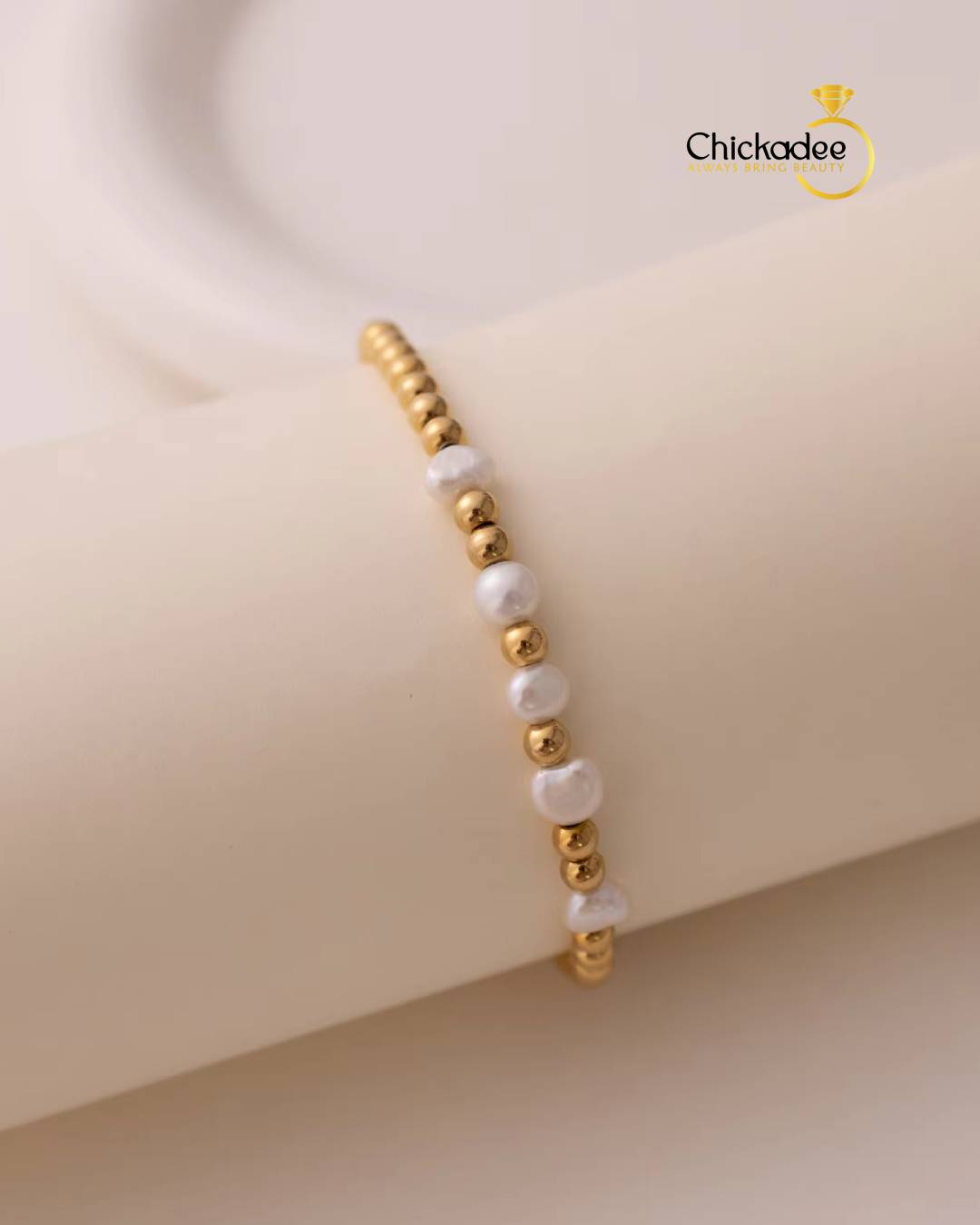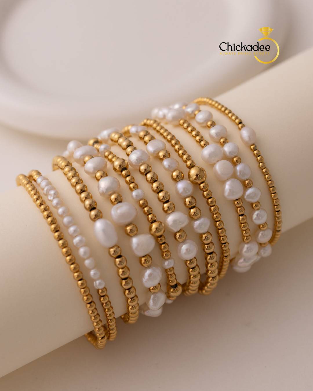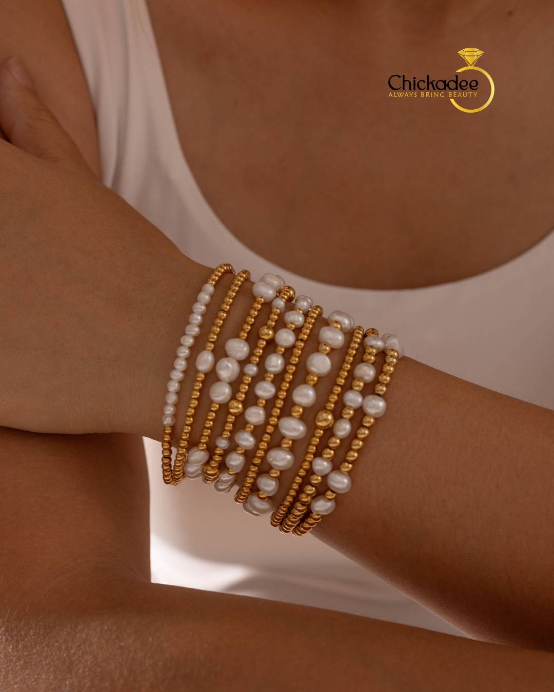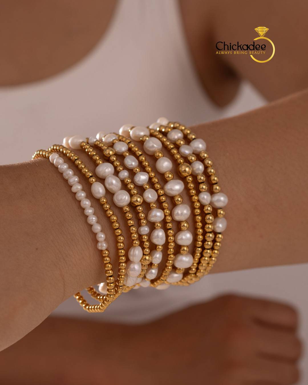 Dainty 18K Gold Plated Freshwater Pearl Stretch Bracelet Set Women Fashion Stainless Steel Beads Bracelets Waterproof Jewelry
